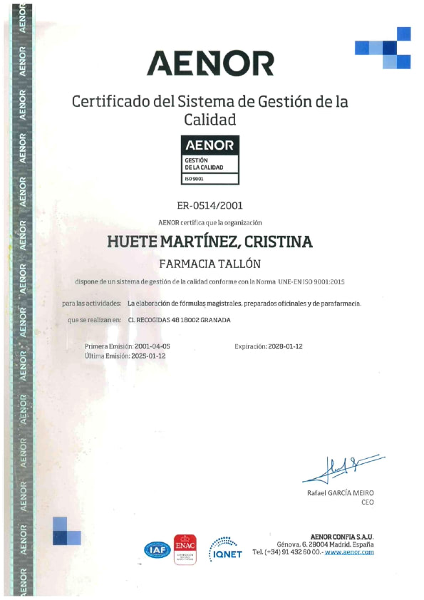 Todos las etapas relacionadas a la elaboración de una fórmula magistral están encaminadas a para que sea segura, eficaz y con garantías de calidad. Para conseguir este objetivo se realizan periódicamente autoinspecciones y auditorías que nos permiten garantizar la calidad que concluye con una auditoría externa que nos permite estar certificada por AENOR.
